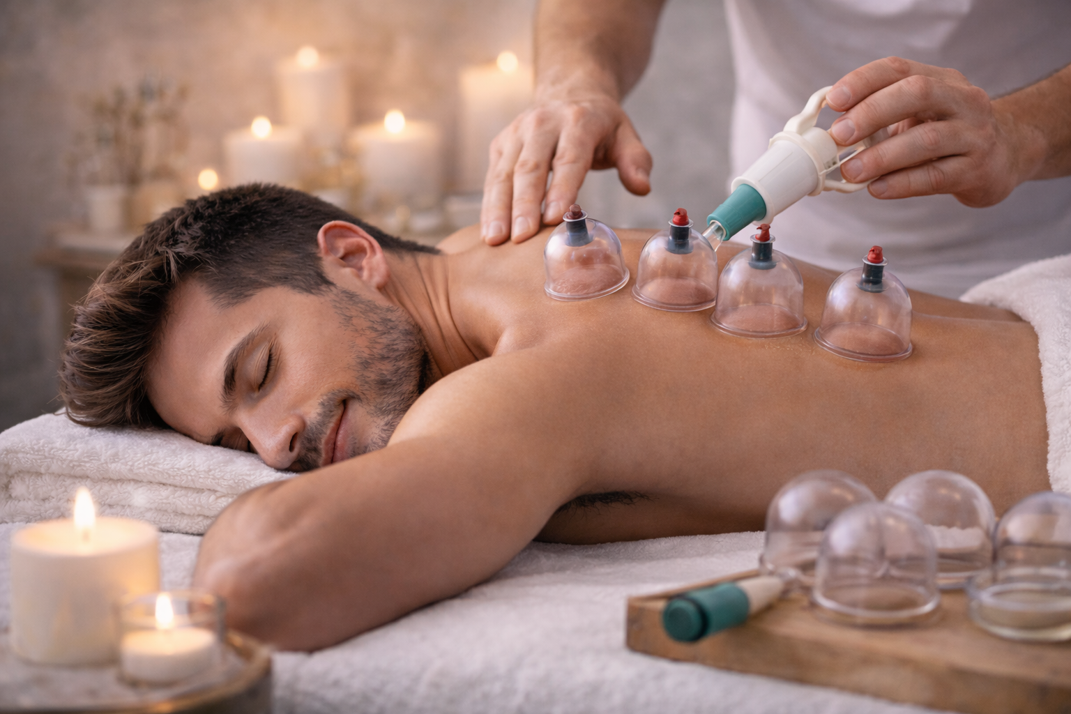 A traditional therapeutic technique that uses suction cups to improve blood flow, release deep muscle tension, and support natural detoxification. Cupping helps loosen tight muscles and promotes faster healing.